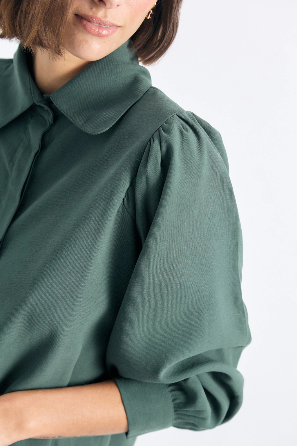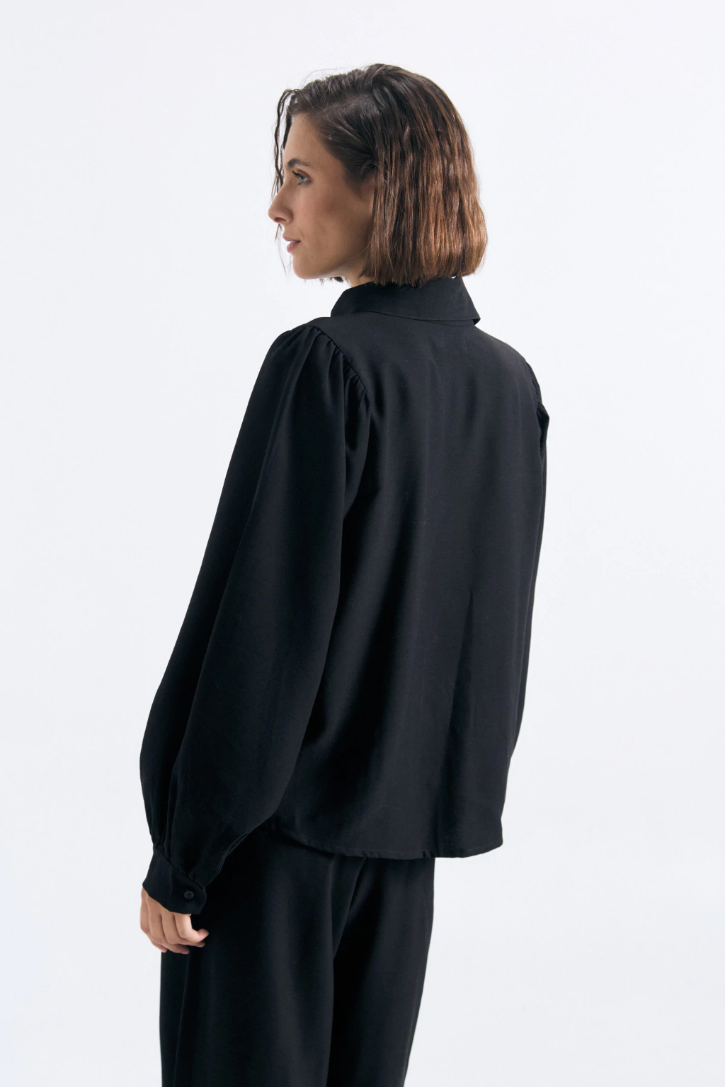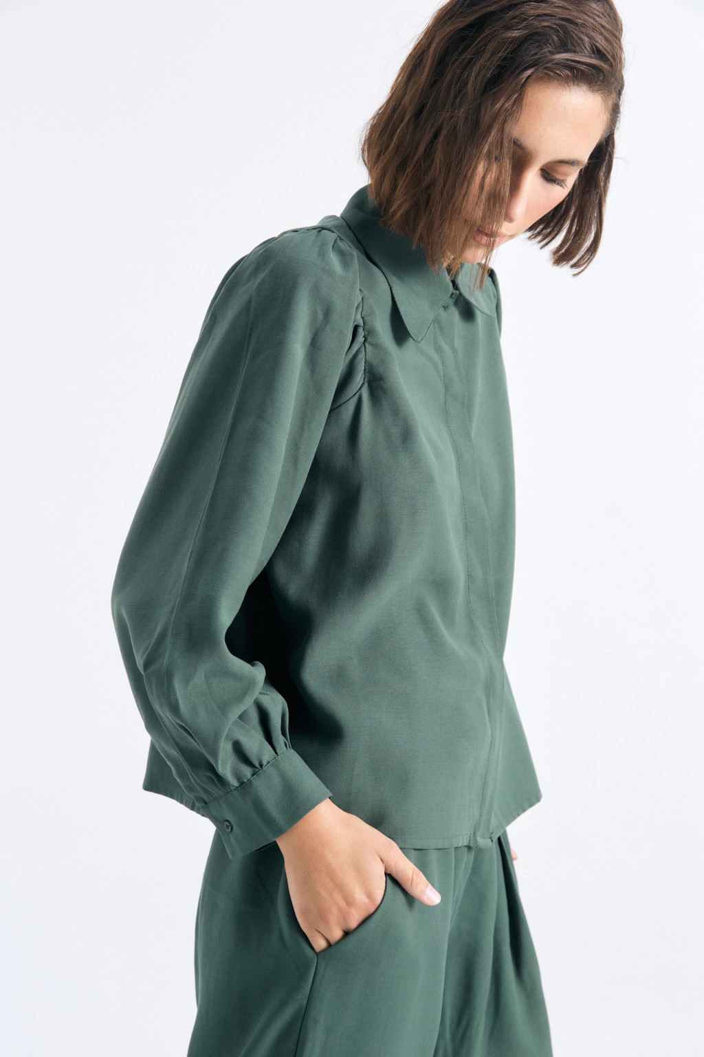 Camisa con cuello semi redondo, con leve frunce en los hombros que la hacen super delicada y algo vintage. Tiene un largo ideal para usar con todo tipo de pantalones, a la media cadera. Su género suave a la piel tiene una caida hermosa y la hace muy cómoda al cuerpo.