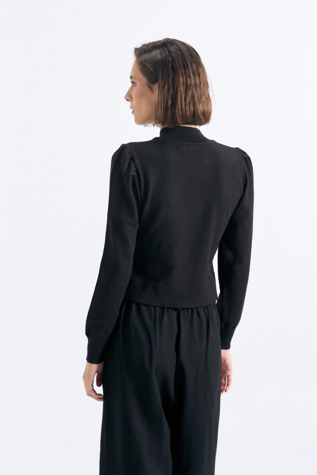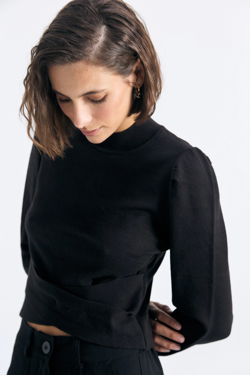 Este sweater tiene todo lo que tiene que tener, escote redondo subidito, hombros abullonados y un cruce al frente que lo hace distinto a todo.