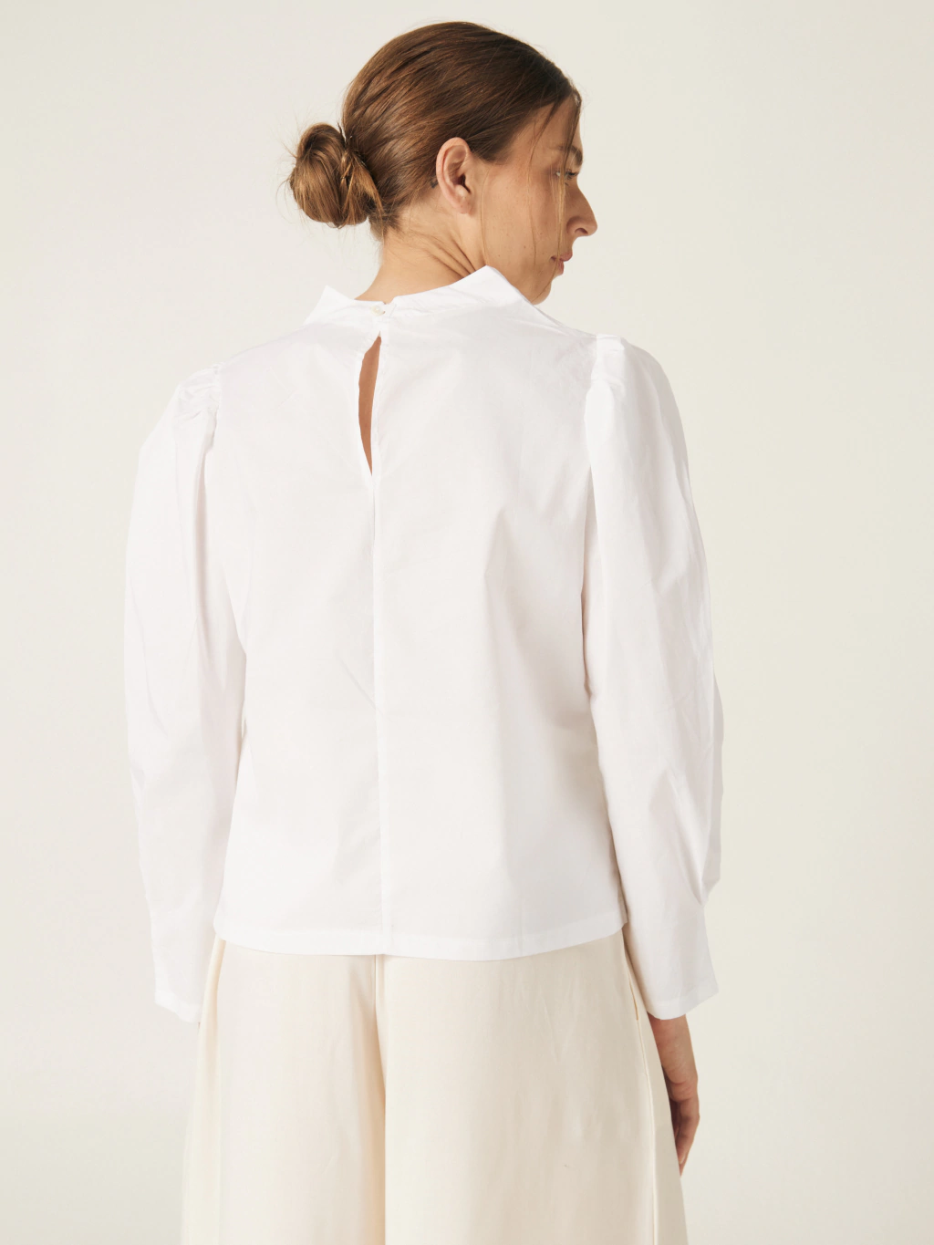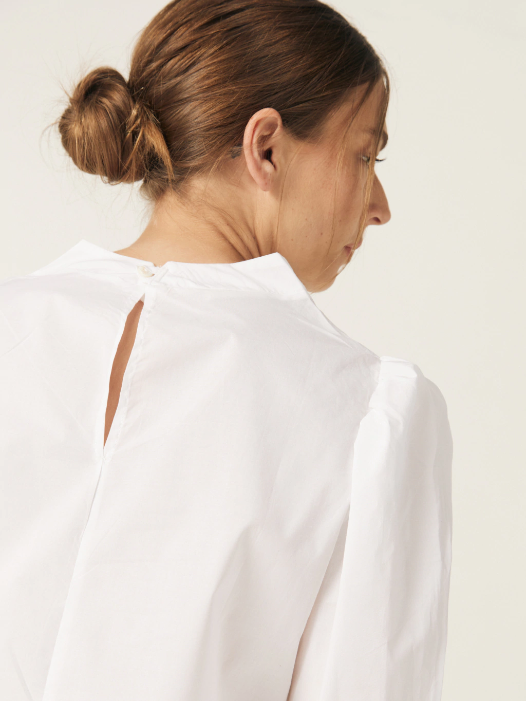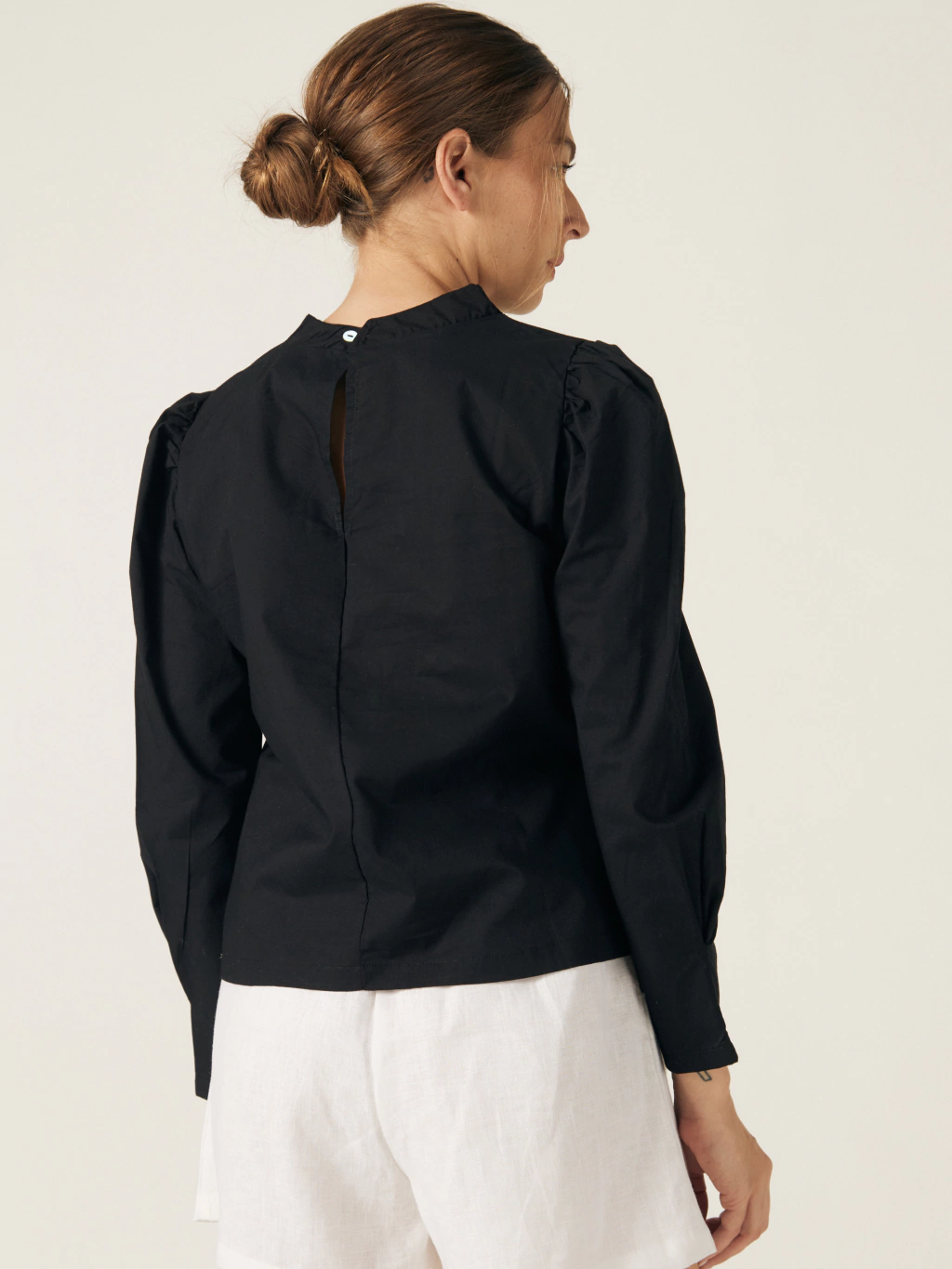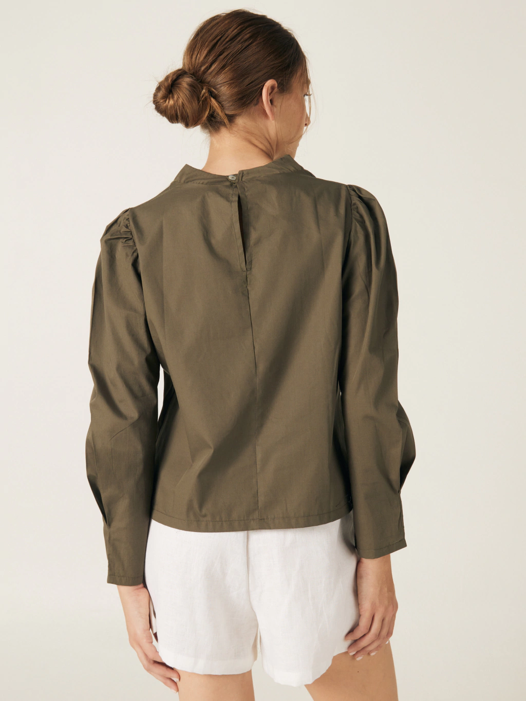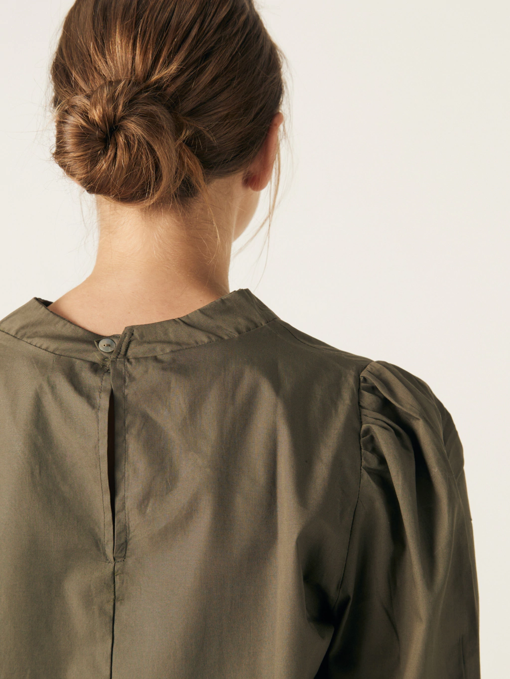 Mangas fruncidas y con pinzas que nacen desde los puños. Escote redondo subidito con tajo en la espalda y sujeto por un botón.
