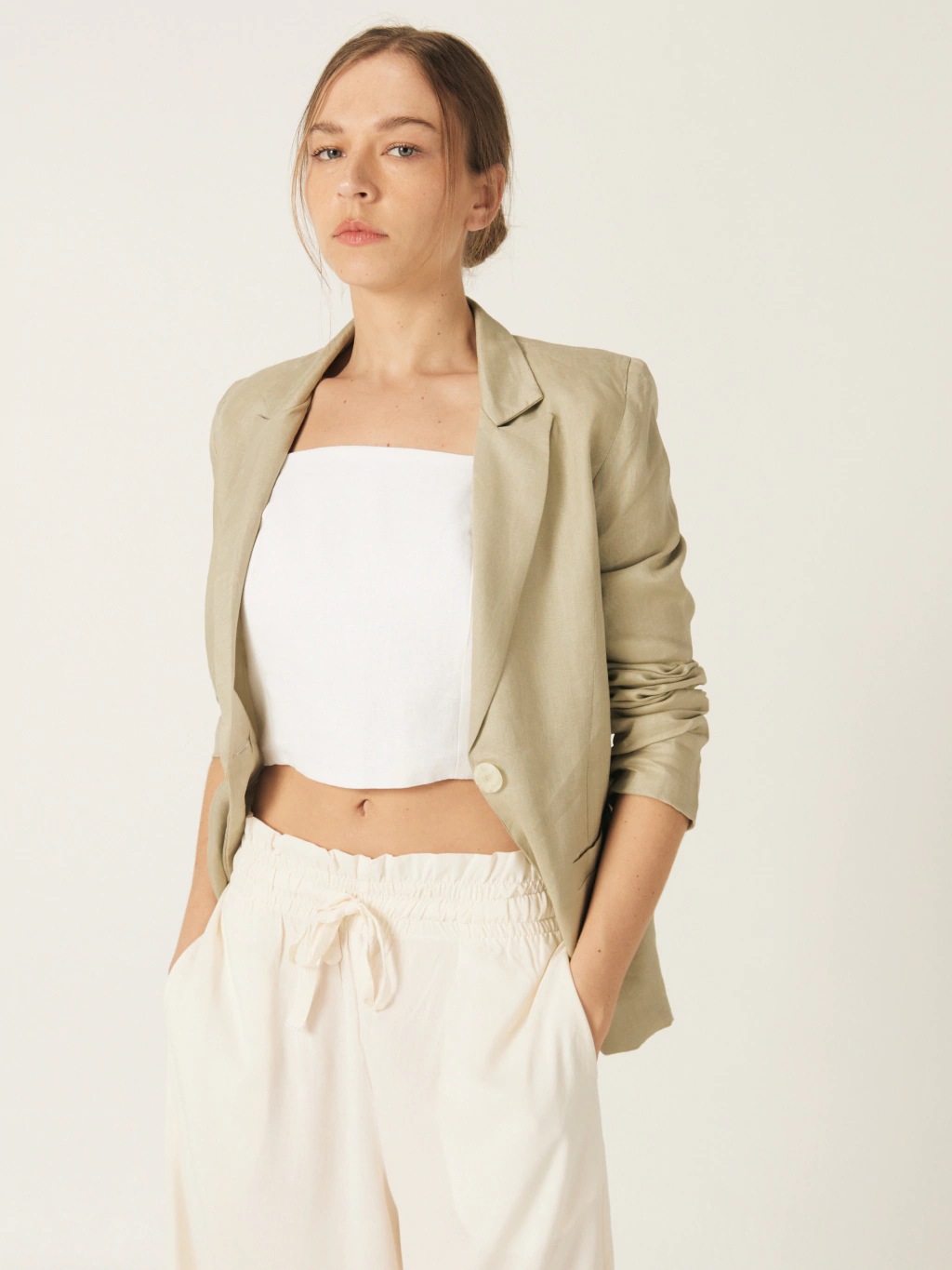 Top de lino que se sujeta atrás con un nudo. Tiras regulables. Recortes al frente. Al tener doble lino no transparenta para poder usarlo sin ropa interior. Tambien se puede usar más corto al doblar hacia el interior la parte de abajo.