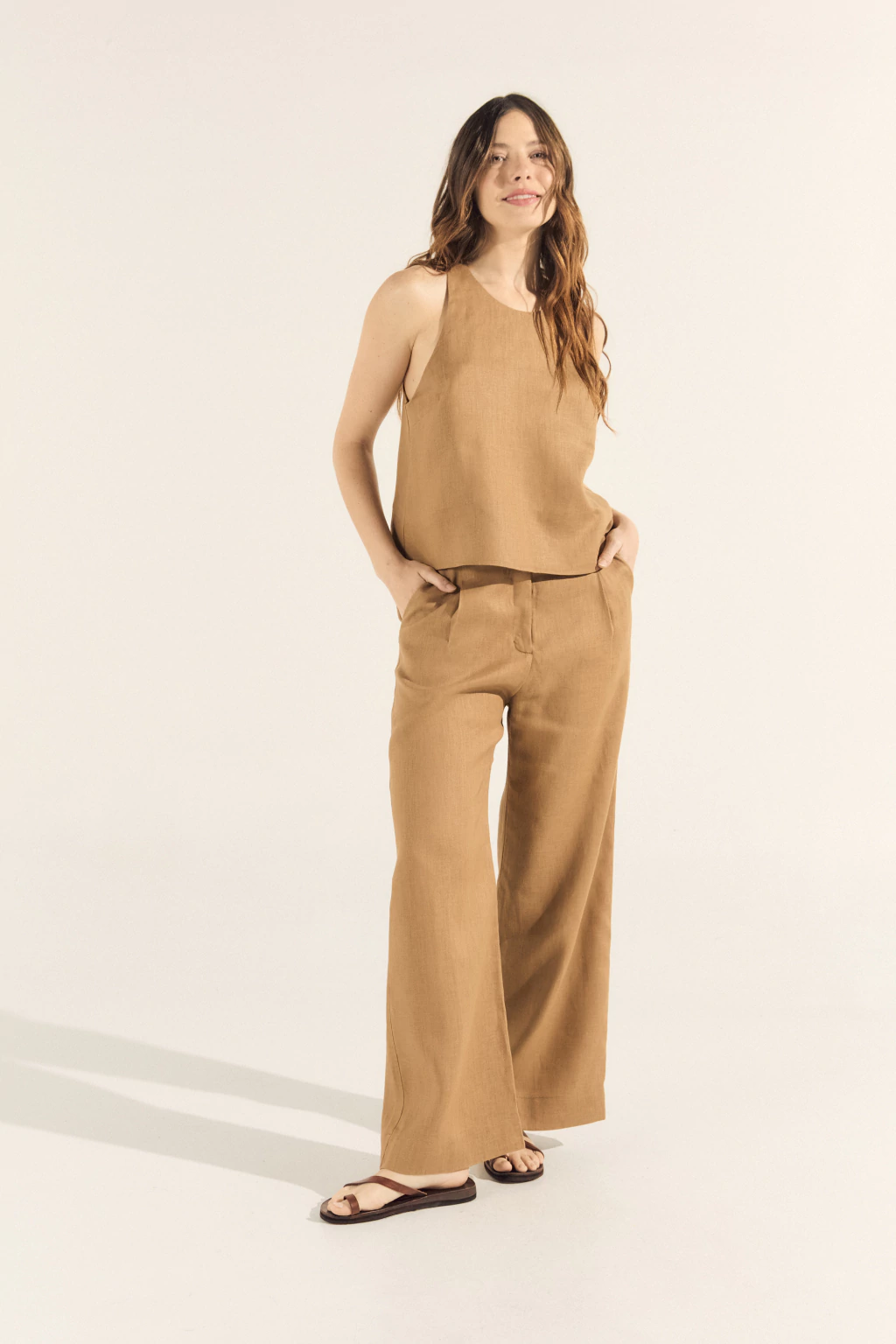 Pantalón de lino tiro alto medio, con elástico en la parte trasera y con el corte justo entre un palazzo y un pantalón recto. Tiene bolsillo al frente y en la parte trasera.